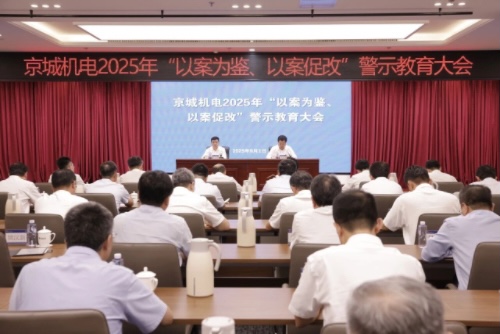 9月1日,京城机电召开2025年“以案为鉴、以案促改”警示教育大会。京城机电党委书记、董事长阮忠奎对党员领导干部进行警示教育并讲话,党委副书记、总经理李忠波主持会议。